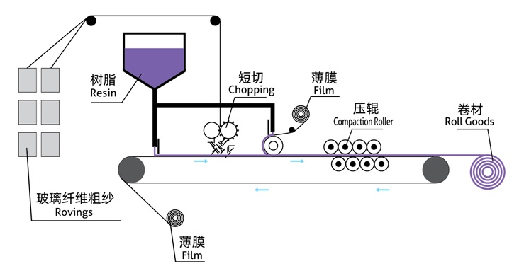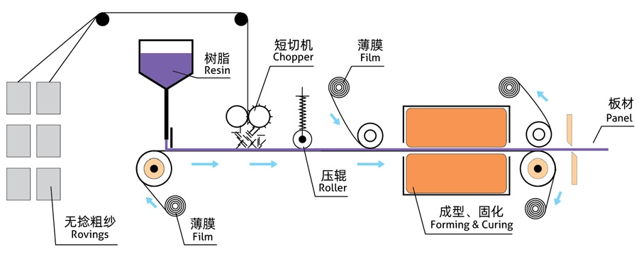 连续板成型工艺是在连续成型机组上使不饱和聚酯树脂浸润玻璃纤维,然后通过模板加热定型固化得到特定截面形状的连续板材的一种工艺。具体可以是,连续玻璃纤维无捻粗纱经过切刀被切割成定长的纤维均匀撒落到树脂层上(或短切纤维毡铺放在树脂层上),进行浸胶挤胶加热;上部再放一层防老化膜,这样上、下薄膜之间的玻璃纤维与树脂层组成一个夹层带。夹层带通过不同的截面模板成形,然后进入固化炉固化定型。之后再对定型后的玻璃钢板材进行切割。 FRP板材与其他材质板相比,具有轻质、高强、抗冲击性好等特点,尤其是它具有独特的透光性及断面可设计性。