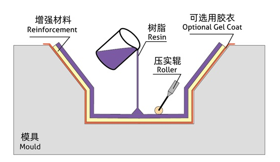 手糊成型工艺又称为低压接触成型,是复合材料工业最早使用的一种成型工艺方法。首先将准备好的模具涂脱模剂,然后将加有固化剂的树脂混合液涂覆到逐层铺覆在模具上的玻璃纤维材料上使其完全浸渍,铺覆到设计厚度,通过固化、脱模形成制品。此成型工艺无尺寸限制,模具材料便宜,在生产大型制品方面仍有一定优势。