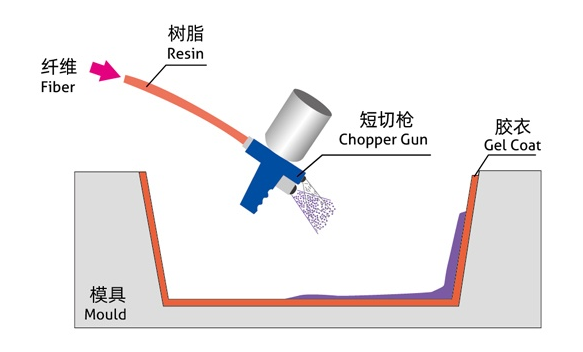 喷射成型工艺时利用喷射设备将树脂雾化,并与即时切断的纤维在空间混合后,落在模具面上,然后压实排除气泡,固化成型的一种工艺方法。喷射成型时在手糊的基础上发展起来的,其将手糊操作中的纤维铺覆和浸胶工作由设备来完成,是一种相对效率较高的成型工艺。